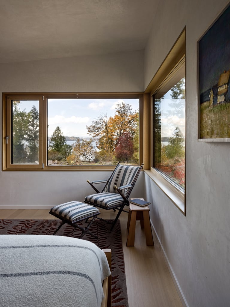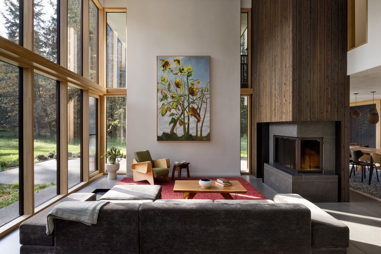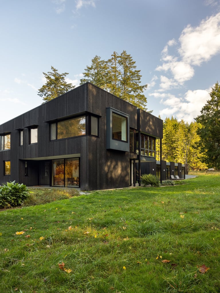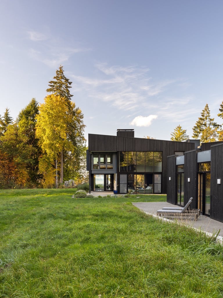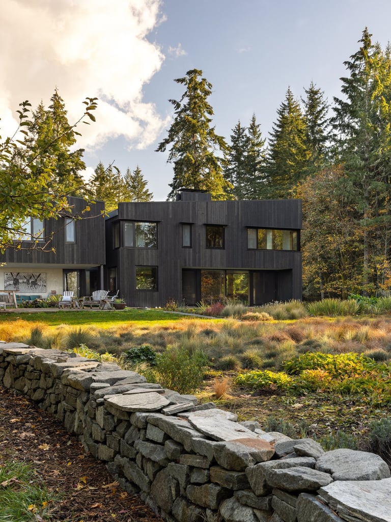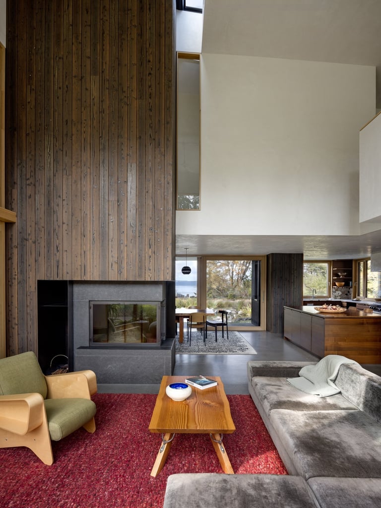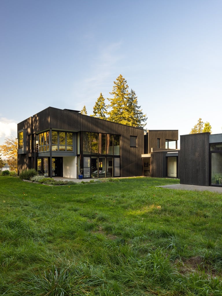 Set in natural landscaping on a bluff overlooking the Puget Sound, this home embodies the client's eco-conscious lifestyle and inspired artistic aesthetic. The design utilizes age-old Shou Sugi Ban siding, soft plaster interiors, and high efficiency systems including geothermal heating.