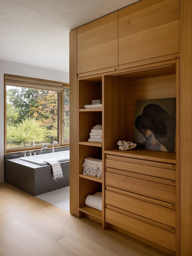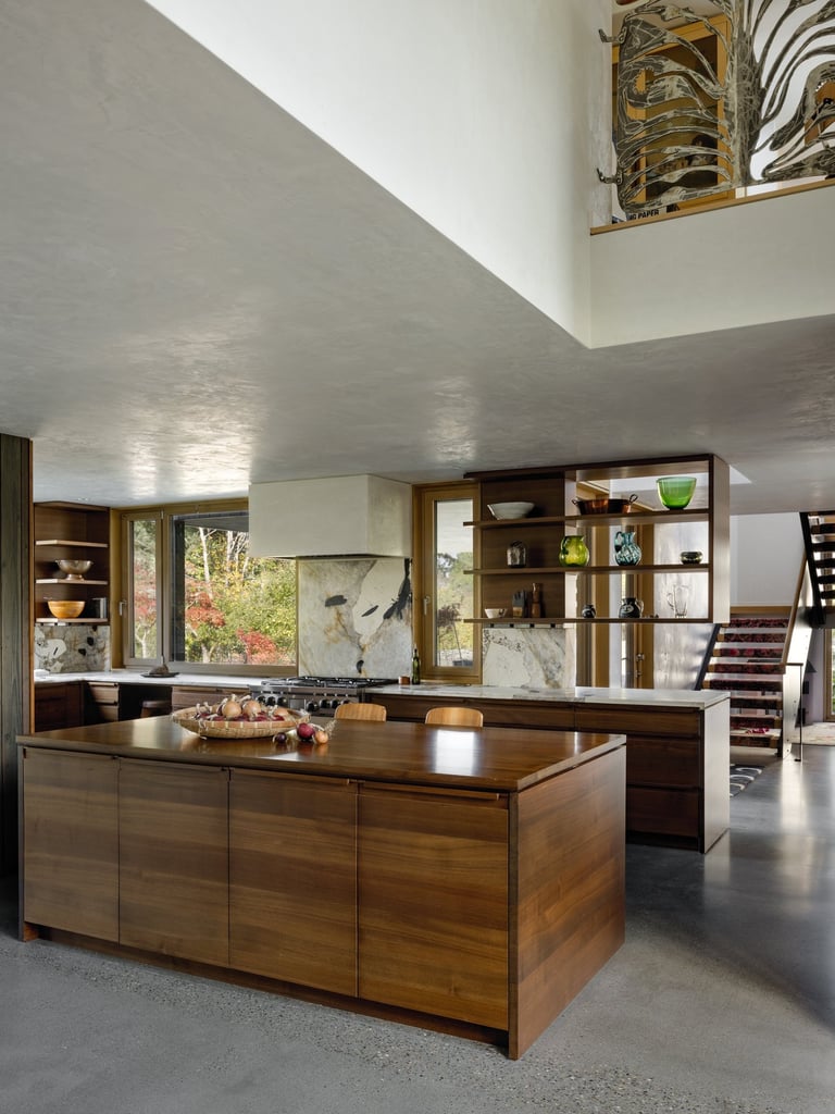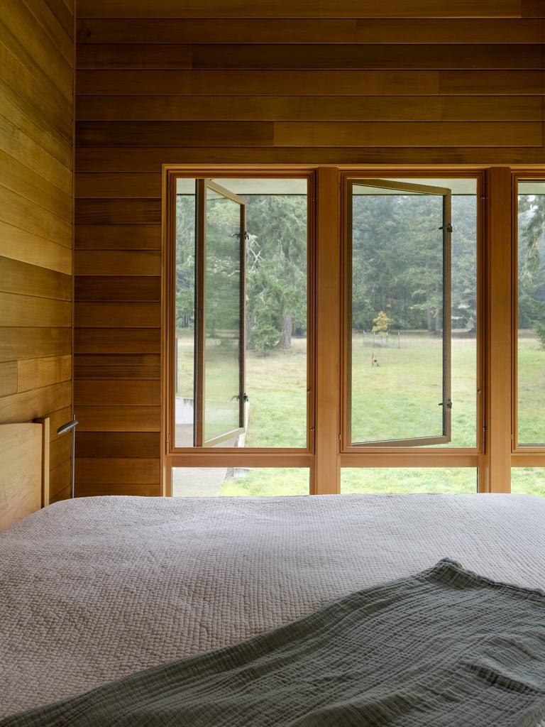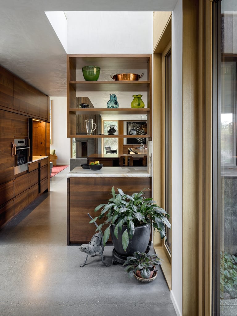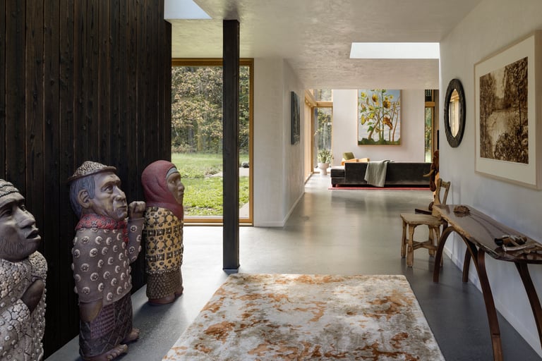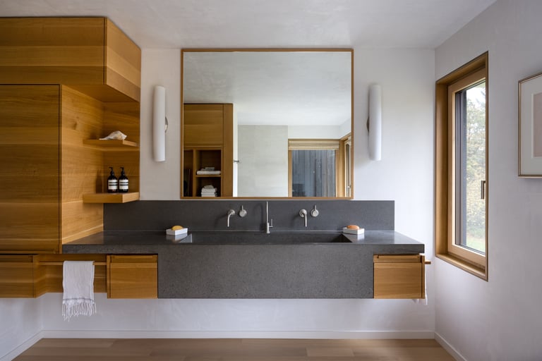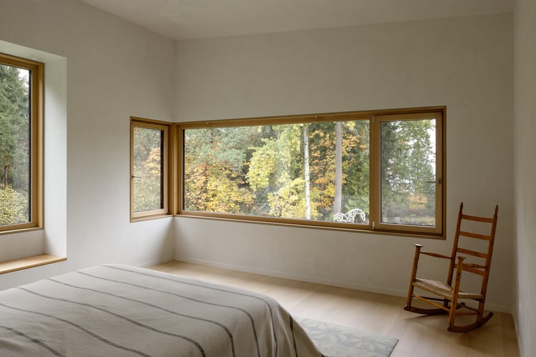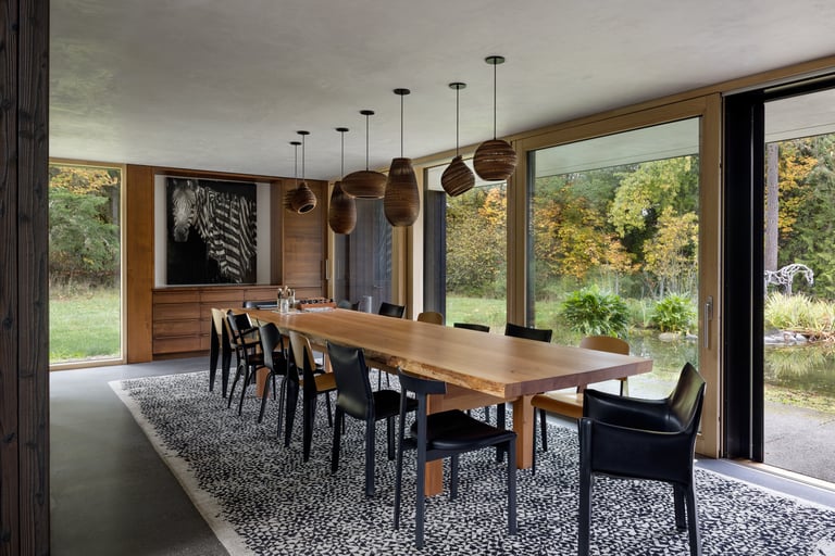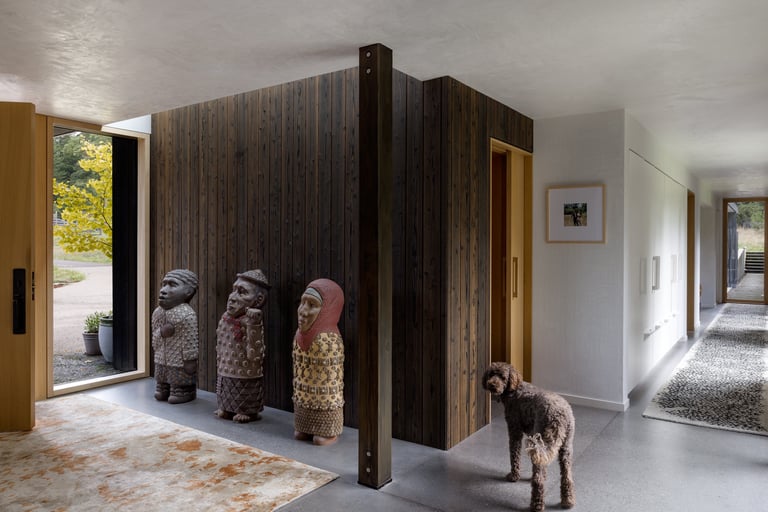 Set in natural landscaping on a bluff overlooking the Puget Sound, this home embodies the client's eco-conscious lifestyle and inspired artistic aesthetic. The design utilizes age-old Shou Sugi Ban siding, soft plaster interiors, and high efficiency systems including geothermal heating.