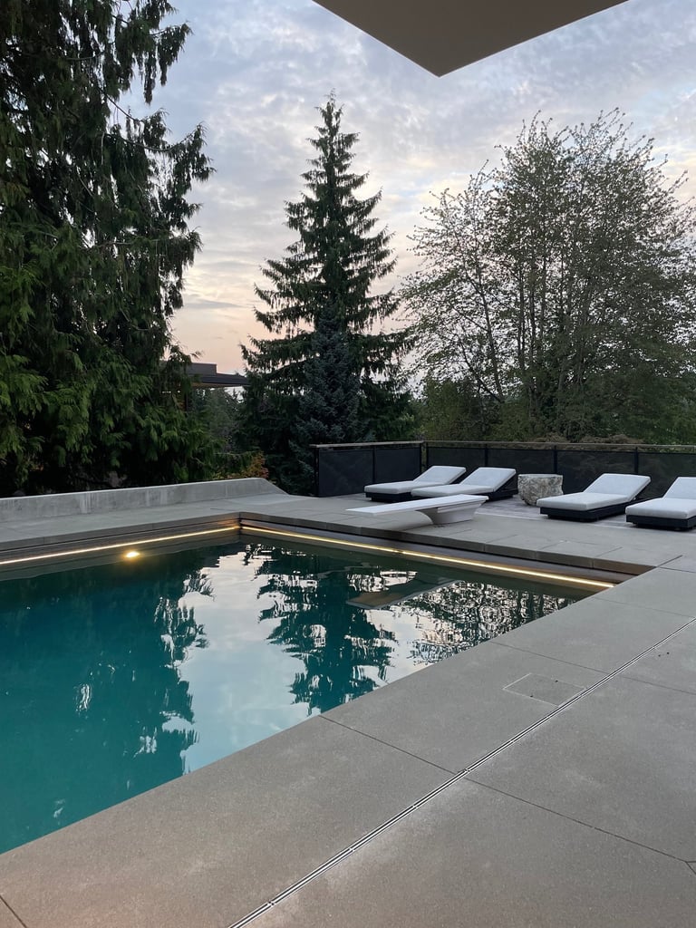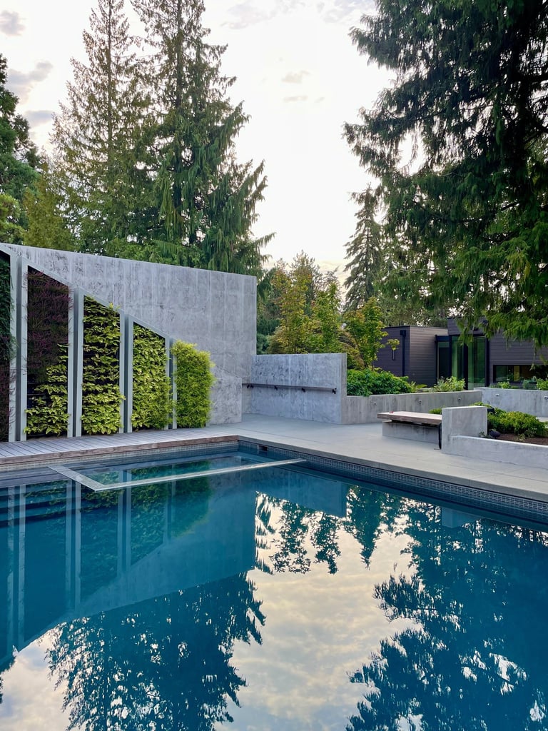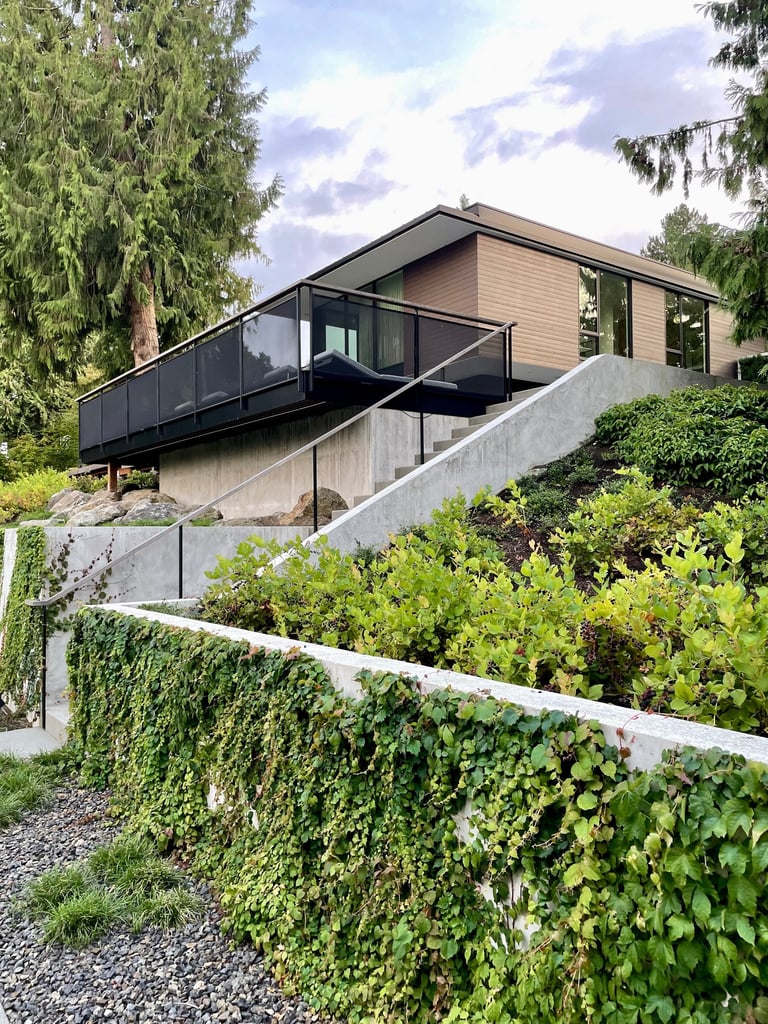 The guest house to the Eastside Residence mimics its larger partner in both form and materiality. The relatively modest footprint takes advantage of the sloping property to seamlessly connect levels across to the main house. The upper entry level living quarters features two bedroom suites perched above the pool and cabana level below. The upper level and the sun deck reach out into the landscape, suspending guests within the evergreen canopy. The site was designed to connect with the main house along curated walkways and view corridors. Take a look at the Eastside Residence project page for a closer look at the main house.