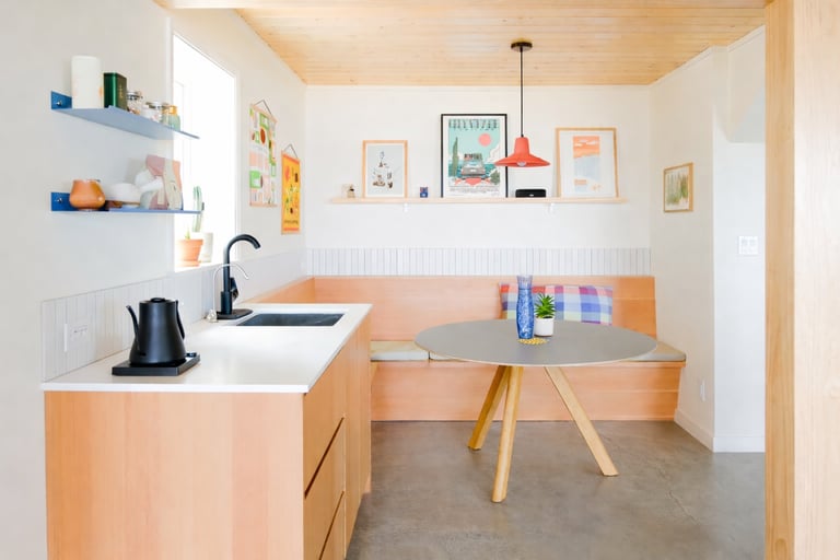 Set on the shore of south Puget Sound, the owners of this mid-century home wanted to infuse their lower level with a bright and cozy Japandi style. With existing picture windows cropping serene waters of the sound, we sought to enhance that feeling with natural but refined finishes throughout and direct attention towards the windows. The original disjointed layout and aged materials did not suit their functional needs or personal tastes. We re-organized the bath and laundry areas into a larger bath and created a guest suite to allow privacy for visiting friends and family while maintaining everyday usability for the owners. The entertaining area was opened and optimized for both lounging and hosting. The owners, being well traveled and design oriented, finished out the spaces with lively pops of art, texture, and color.
