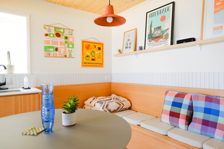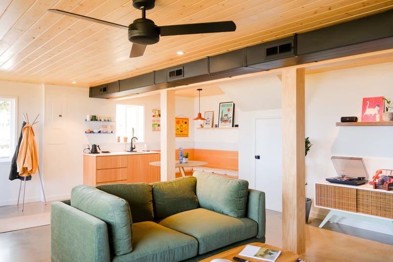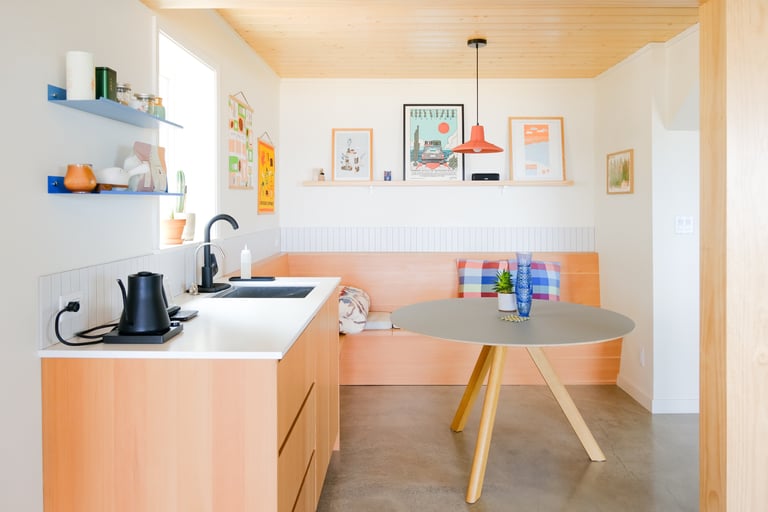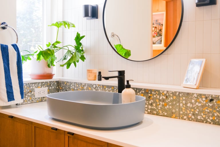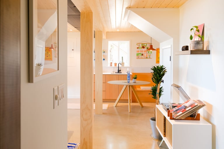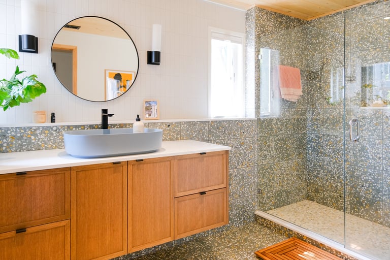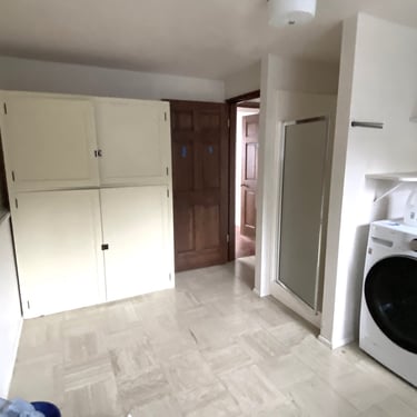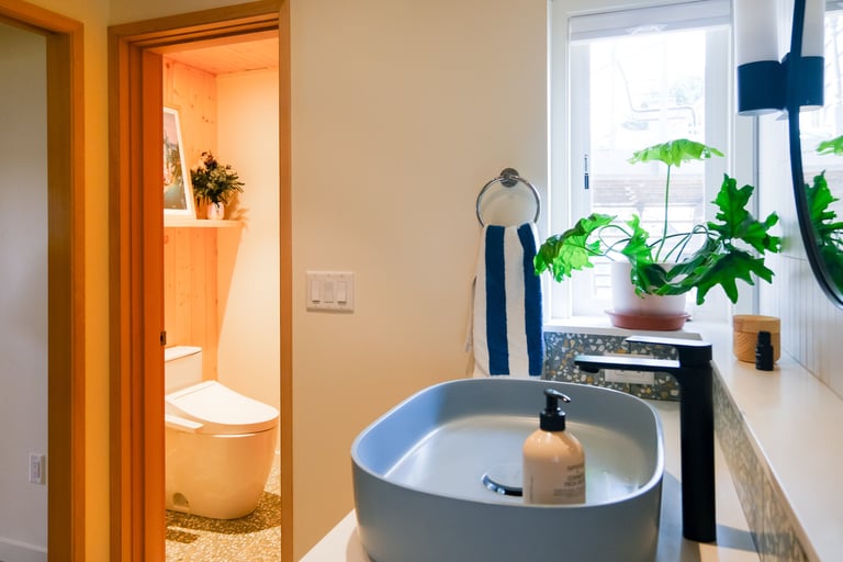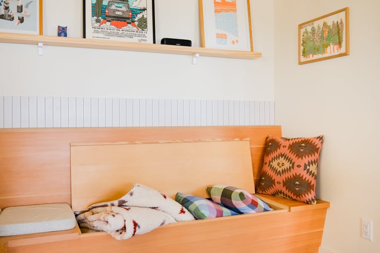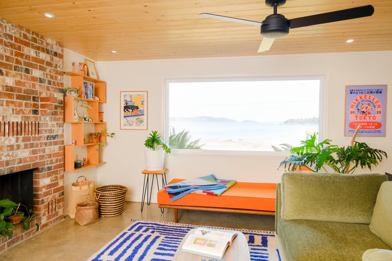 Set on the shore of south Puget Sound, the owners of this mid-century home wanted to infuse their lower level with a bright and cozy Japandi style. With existing picture windows cropping serene waters of the sound, we sought to enhance that feeling with natural but refined finishes throughout and direct attention towards the windows. The original disjointed layout and aged materials did not suit their functional needs or personal tastes. We re-organized the bath and laundry areas into a larger bath and created a guest suite to allow privacy for visiting friends and family while maintaining everyday usability for the owners. The entertaining area was opened and optimized for both lounging and hosting. The owners, being well traveled and design oriented, finished out the spaces with lively pops of art, texture, and color.